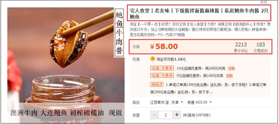然后你在看第二张图:谁说牛肉酱就只能有牛肉了?来,我再给你加上一个高端的食材:鲍鱼。每瓶牛肉酱里面有两个鲍鱼,那大家知道两个鲍鱼的成本是多少钱么?大家可以自己去1688上看看。两只鲍鱼的成本不可能超过20块钱,但是这个商品已经可以卖到将近60块钱了,针对原来的10几块钱,溢价的幅度很高吧。