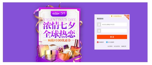 如图5淘宝的登陆页面海报,则是以浪漫神秘的紫色系为主要搭配颜色,配以紫色渐变的文字,丝带等元素制作的。