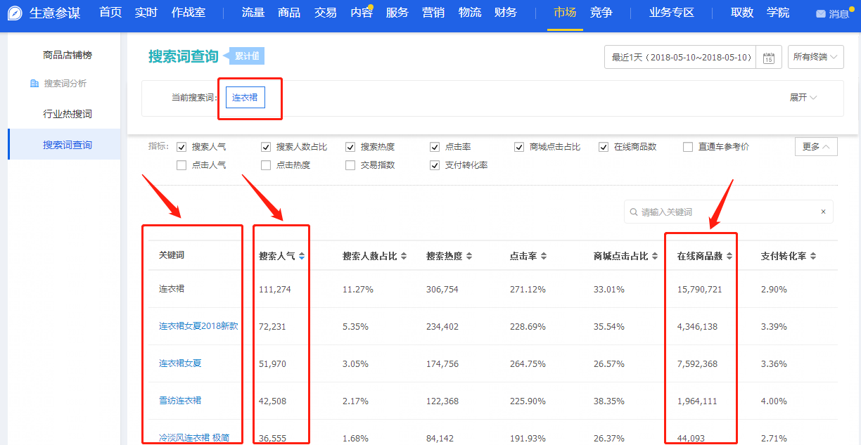 6. 生意参谋,市场行情选款:精确、可以准确查看相关延伸词、搜索人气、在线商品数,从而选择竞争度高的商品进行打造。